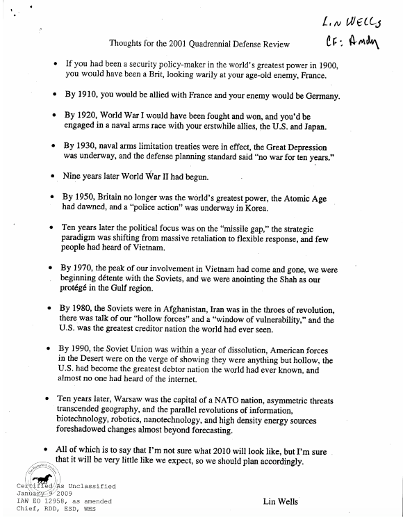 One of my favorite examples of this is this memo from Pentagon employee Lin Wells to George W. Bush: Predicting the Future.